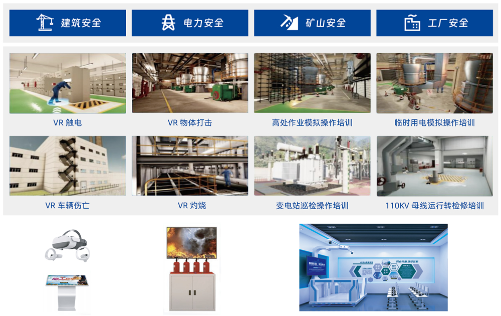 VR 临境式实训安全教育系统,以现实培训环境为基础,基于沉浸式虚拟互动仿真技术搭建典型行业作业场景,让学员置身于各种复杂、难度不一的生产虚拟场景中,在确保人身安全的前提下进行高仿真的模拟培训,有效提升学员的应变能力和实操技能,提升培训效果,突破时空限制,降低培训成本。